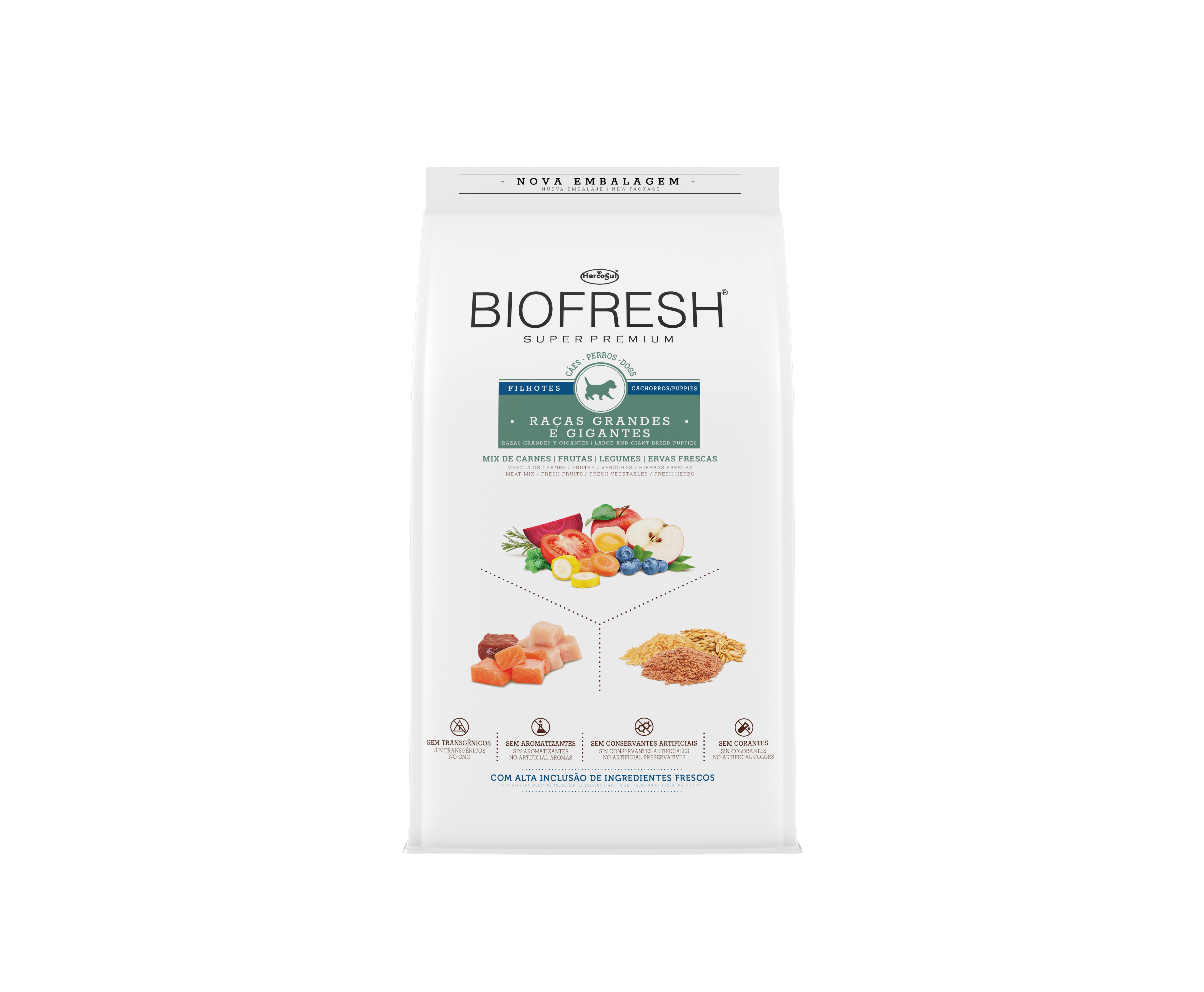 es un alimento Super Premium completo y equilibrado que se destaca para elevar la nutrición de los cachorros de razas grandes y gigantes a su más alto nivel. Biofresh es innovador y diferente, porque esta formulado con una alta inclusión de ingredientes realmente frescos, directamente de la naturaleza. La tecnología Biofresh garantiza la conservación de este alimento de forma 100% natural y segura, sin conservantes artificiales añadidos.