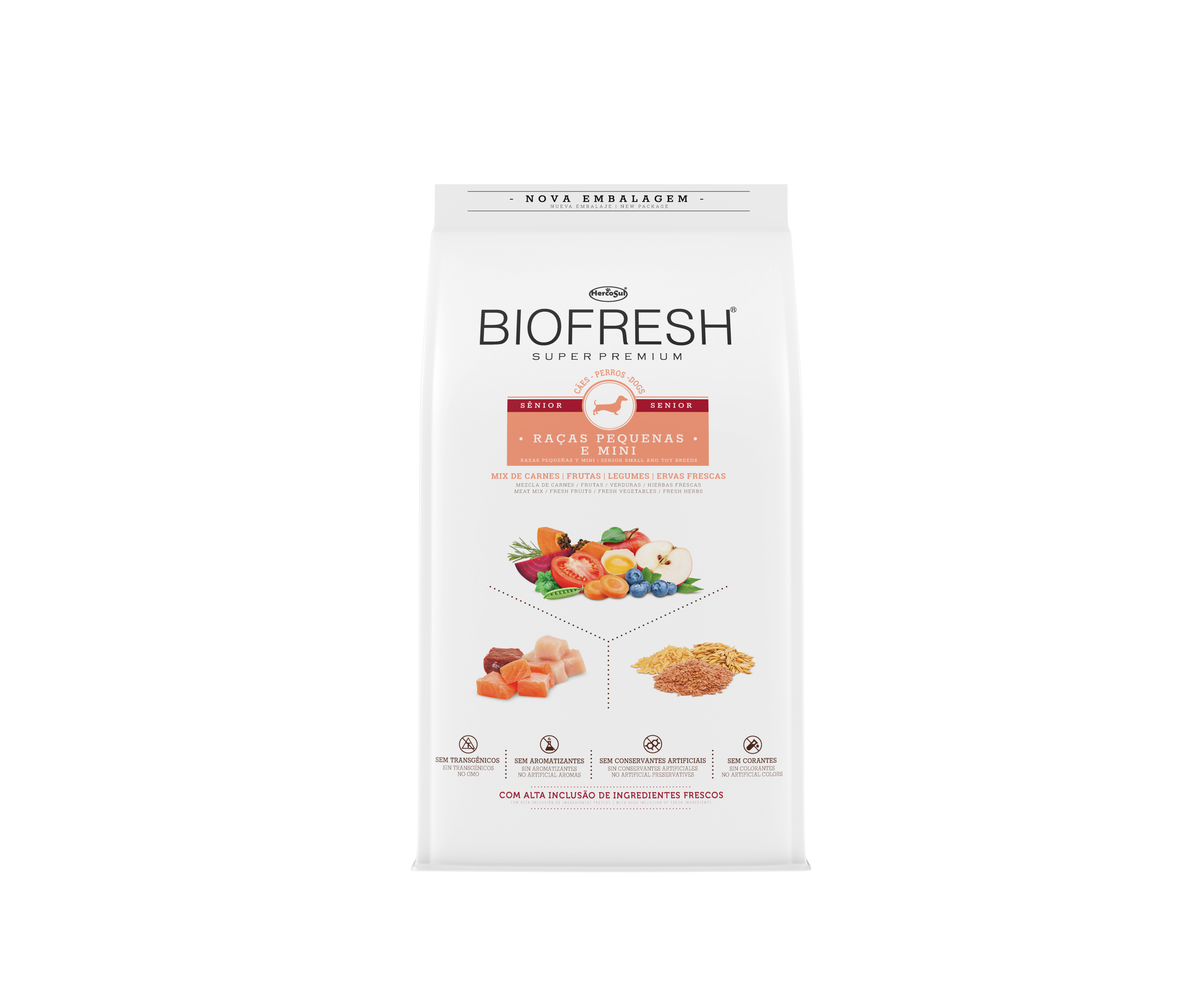 Biofresh Super Premium es innovador y diferente, porque tiene ALTA INCLUSIÓN DE INGREDIENTES REALMENTE FRESCOS, directamente de la naturaleza. El resultado es un alimento completo y equilibrado que se destaca por elevar la nutrición de los perros mayores de razas pequeñas y mini a su más alto nivel. Biofresh Super Premium Senior ayuda a preservar características muy importantes de la juventud, tales como los músculos fuertes, la agilidad mental y la salud de los aparatos digestivo, renal y cardíaco. La TECNOLOGÍA Biofresh garantiza la conservación de este alimento de forma 100% natural y segura,  SIN CONSERVANTES ARTIFICIALES AÑADIDOS.
