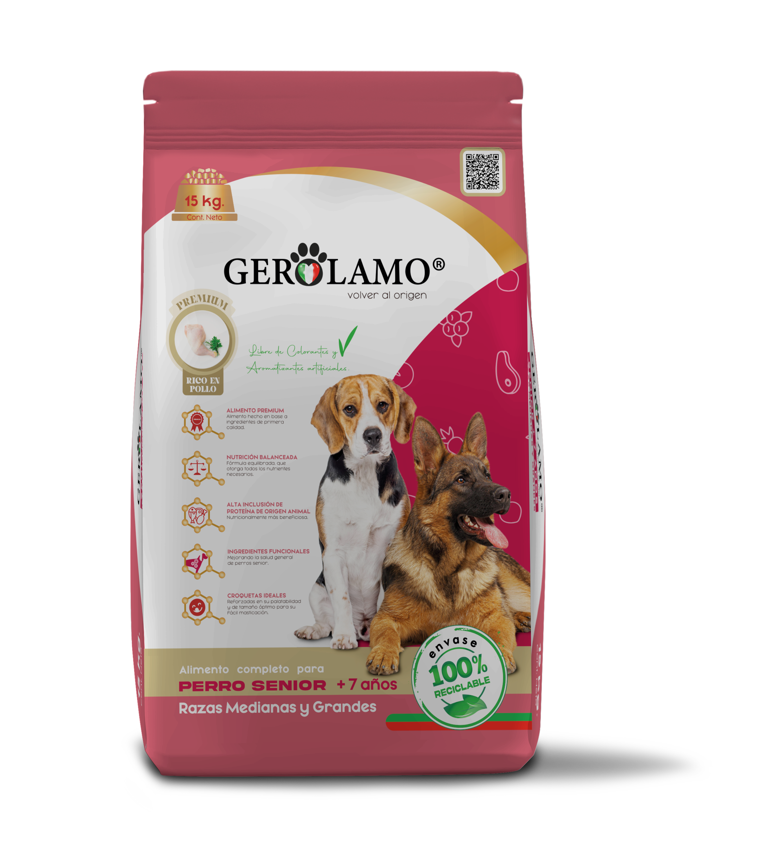 Gerolamo Premium Perro Senior para razas medianas y grandes es un alimento completo y balanceado elaborado para cuidar las necesidades que se presentan en esta etapa considerando las particularidades de estas razas como el cuidado articular y la mantención del peso ideal, siempre con la utilización de ingredientes de alta calidad para garantizar el aporte de cada nutriente. Además, con la adición de prebióticos y moduladores fecales estimula las defensas naturales y favorece la salud digestiva.